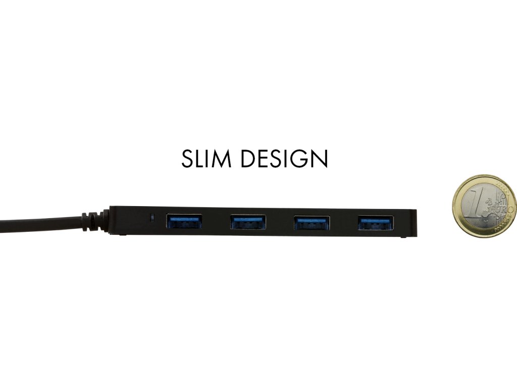 Tento HUB nabízí čtyři USB 3.0 porty s funkcí Plug & Play a standardním USB nabíjením – HUB automaticky detekuje, jestli je připojeno zařízení pro USB nabíjení. Rozhraní USB 3.0 je důležité zejména pro datové přenosy z USB 3.0 paměťových karet a flash disků, kde se nejvíce využije jeho vysoká přenosová rychlost. LED dioda zobrazuje stav čtení a zápisu dat.