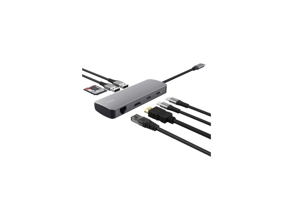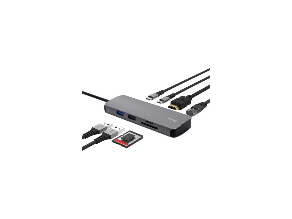 TRUST Dokovací stanice DALYX USB-C, 8v1, HDMI, RJ45, 2xUSB-C, 2xUSB-A, microSD/SD karta, šedá