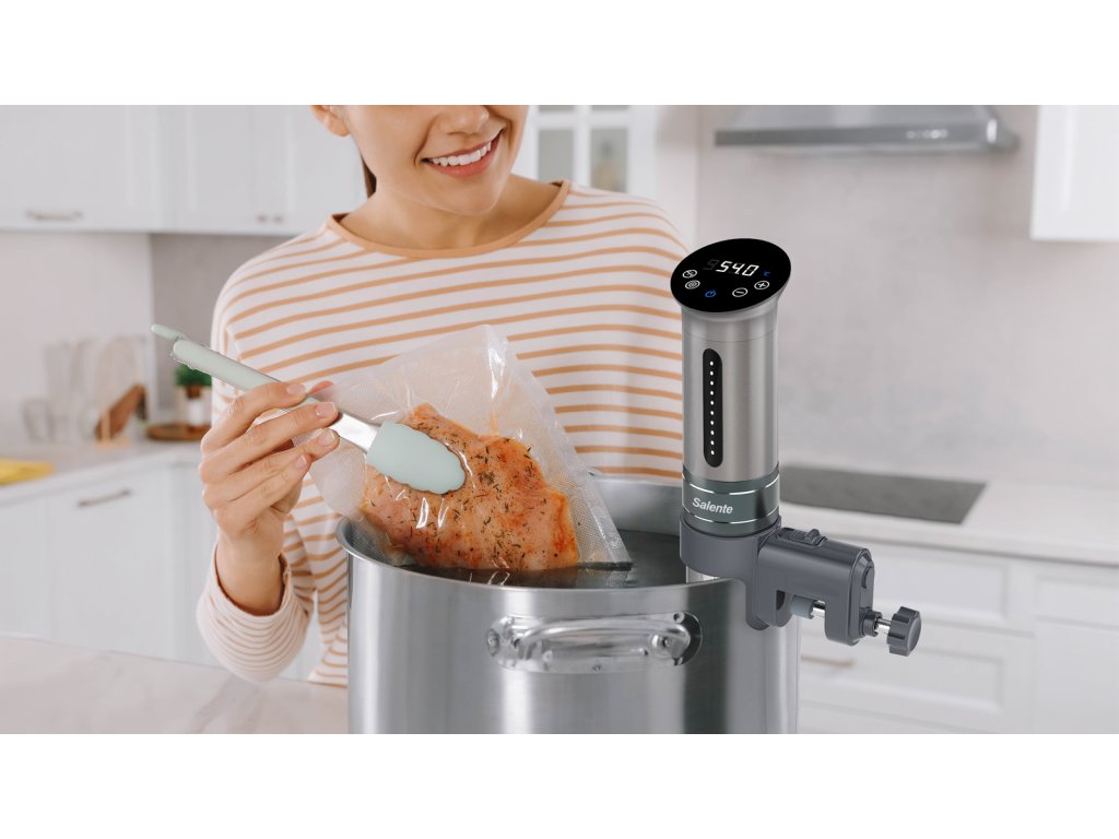 Sous Vide vařič Salente SuChef přináší do kuchyně jednu z nejmodernějších metod vaření profesionálních kuchařů z michelinských restaurací – pomalé vaření zavakuovaných ingrediencí ve vodní lázni při konstantní nízké teplotě. Díky této metodě ingredience naztrácejí svou hmotnost, zachovávají si šťavnatost, texturu, důležité vitamíny, minerály, živiny i nutriční hodnoty. Oproti klasickým metodám příprav si udrží i výraznější a lepší chuť, vůni i barvu. Velmi důležitým benefitem je skutečnost, že pokrm nelze ani připálit ani rozvařit a jedná se o zdravou přípravu bez tuků a olejů.