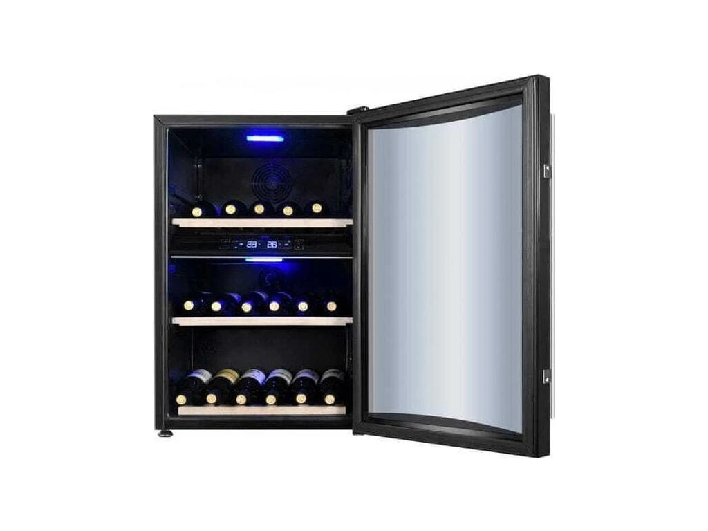 Vinotéka, presklená, trieda G, kapacita 40 fliaš, elektronické ovládanie s LED displayom a digitálnym termostatom, 2 zóny: horná od 5°C do 12°C, dolná od 12°C do 22°C, vnútorné LED osvetlenie, 4 drevené police, nastaviteľné nožičky, čierne dvere s nerez. rukoväťou