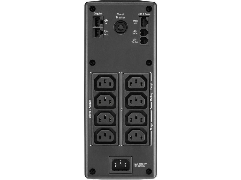 Výstupní přípojky: (6) IEC 320 C13 (Záložní provoz na baterie), (2) IEC 320 C13 (Přepěťová ochrana)