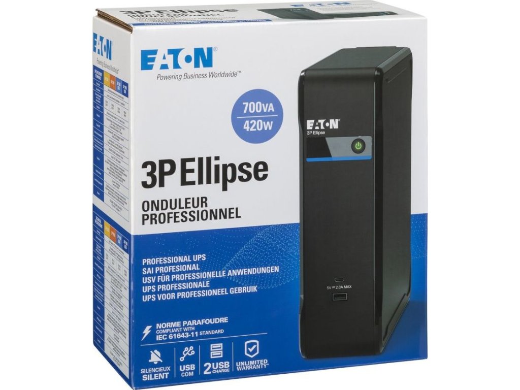 Eaton 3P Ellipse UPS USB FR, 700 VA, 420 W, Vstup: C14, Výstupy: (3) Typ E, (1) Pouze přepěťová ochrana Typ E, USB nabíjení, Tower